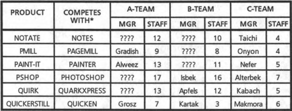 «The Ex-General Markov and the six product managers who were responsible for delivering prod- ucts to compete directly with Quicken, QuarkXpress, Photo- shop, Painter, Lotus Notes, and PageMill, respectively. Under each product manager was an A-Team, a B-Team, and a C- Team, the three separate units competing to produce the best product fastest.»